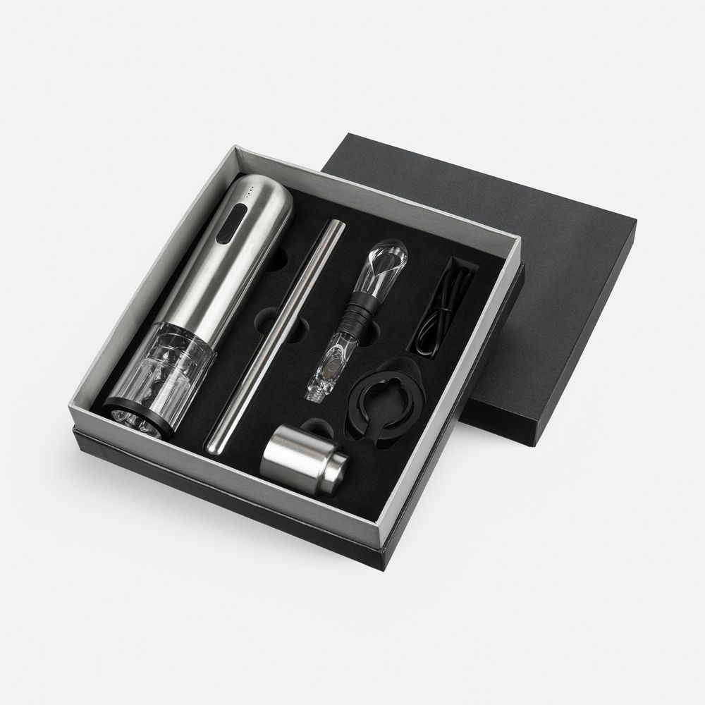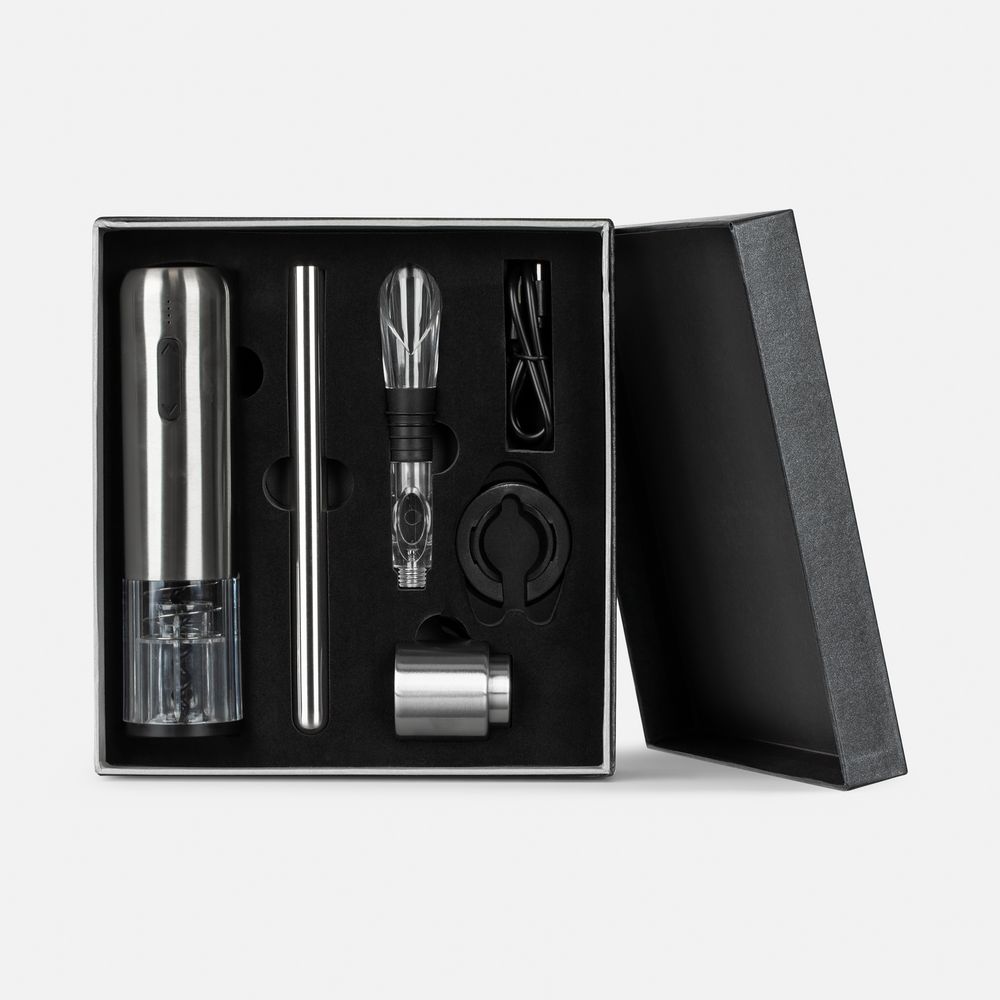 Набор Veritas — настоящая находка для ценителей вин. Благодаря продуманному дизайну использование автоматического штопора практически не требует участия человека. Изящный чиллер поддерживает температуру напитка до часа, удобная разливочная воронка дополнительно аэрирует вино и не позволяет пролить его мимо бокала, а небольшая вакуумная пробка сохраняет вкусовые свойства напитка в течение нескольких дней.