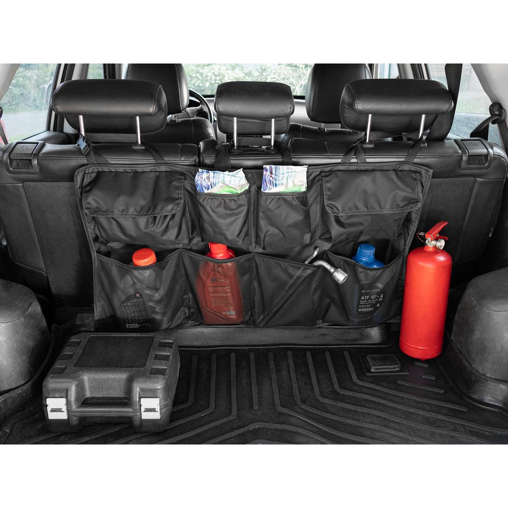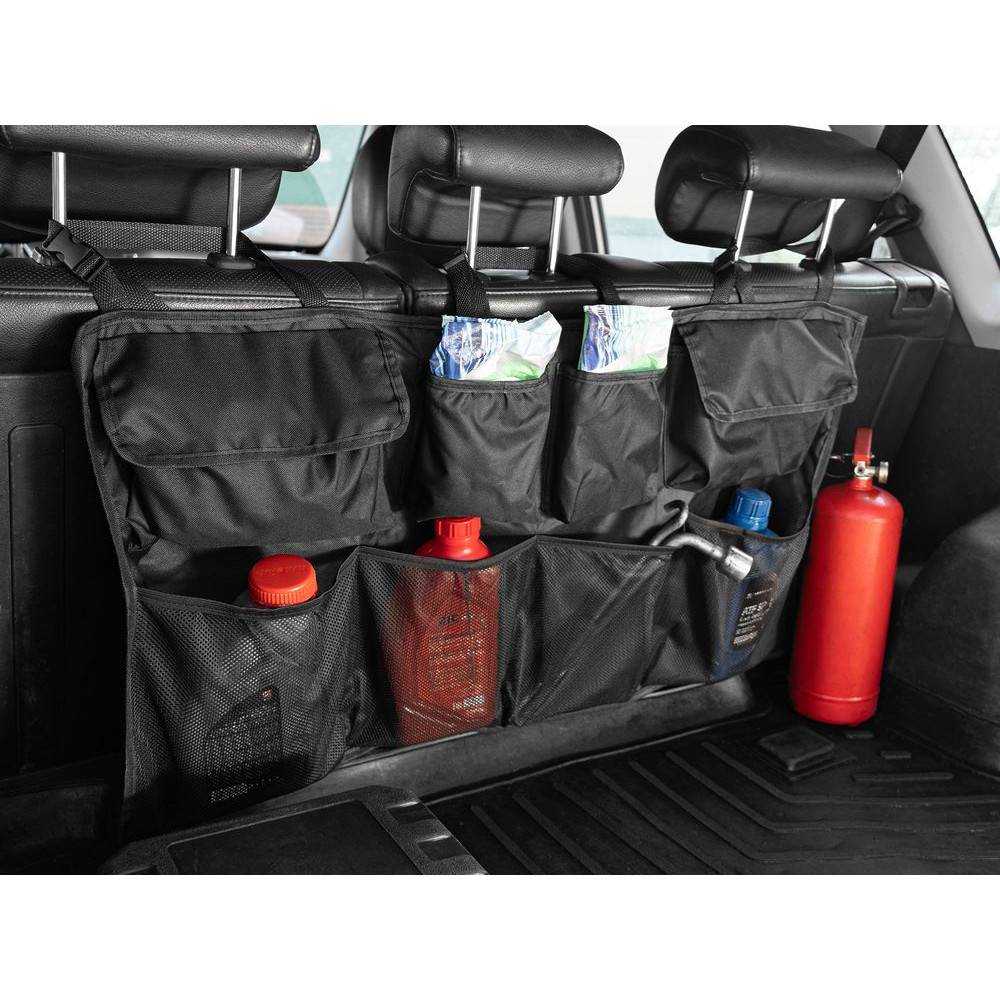 В органайзере имеются разные по форме и типу карманы: карманы-сетки, карманы с крышкой на липучке и открытые карманы. Конструкция крепится ремнями за подголовники задних сидений. Дополнительно на его задней части имеются ленты-липучки, которые обеспечивают полное прилегание к спинкам задних кресел.