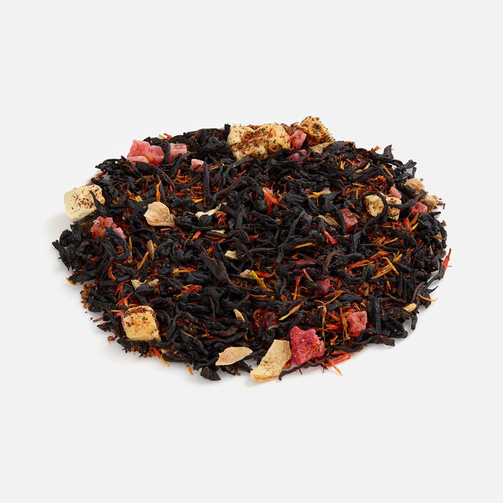 - Чай черный «Кенийский королевский» Состав: чай черный кенийский листовой, цедра лимона, слайсы апельсина, манго сублимированный кусочки, кусочки ананаса, ройбуш, сафлор, ароматизатор «кокос и ананас»